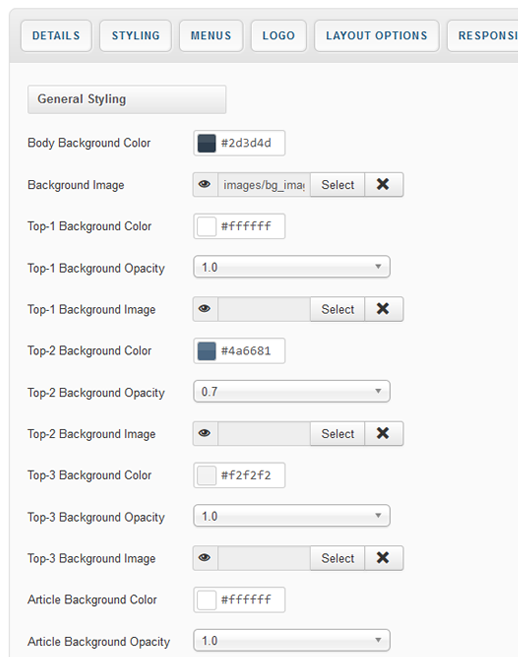 Here you will find some of the main Color Choosers for your template allowing you to control the colour of the main elements of your template including background images and colors, top menu, module positions etc. Other features in this section include font changers allowing to you to choose from 14 websafe fonts and over a 100 Google fonts for a number of different elements of your template including the body, article title and module title fonts. Also included is color choosers to set the article title, module title, content link and buttons to your own taste.