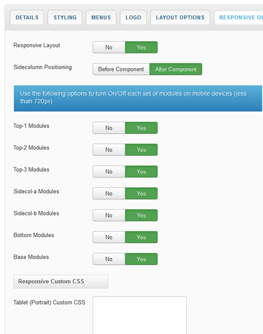 This template has a Reponsive design which allows it to automatically change its layout to best suit smaller screen devices. Options are available to turn enabling/disabling this feature. Disabled your template will be viewed on mobile devices the same as on your desktop monitor. Switchs are also available to enable/disable each row of modules on smaller screen devices.