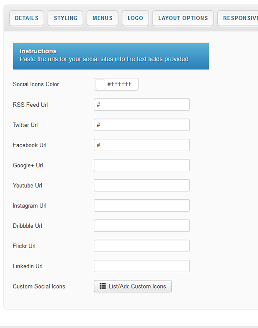 Enable and assign URLs to your social media pages which will appear in the social media panel of the template.